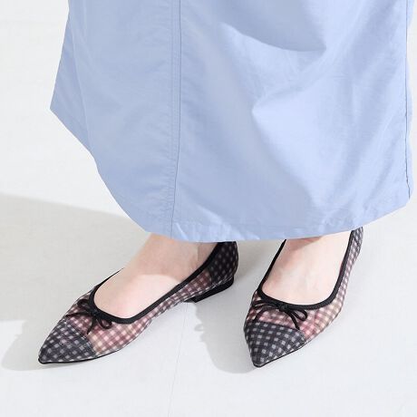 チュール素材×ギンガムチェックを組み合わせた可愛らしいバレエシューズ。つま先は細めのポインテッドトゥで足元をきれいに見せ、アッパーには細めのリボンを施し、大人の女性でも楽しめるデザイン。インソールには凹凸のある仕様を採用し、足裏にフィットして快適な履き心地をサポート。ソックス合わせで早い時期から取り入れられるのが嬉しい。