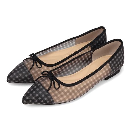 チュール素材×ギンガムチェックを組み合わせた可愛らしいバレエシューズ。つま先は細めのポインテッドトゥで足元をきれいに見せ、アッパーには細めのリボンを施し、大人の女性でも楽しめるデザイン。インソールには凹凸のある仕様を採用し、足裏にフィットして快適な履き心地をサポート。ソックス合わせで早い時期から取り入れられるのが嬉しい。【オススメPOINT】●厚手クッション入り サンプルにて撮影をしておりますので、中敷色、ロゴ色、裏地の色の仕様に変更がある場合がございます。あらかじめご了承ください。