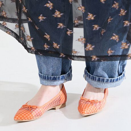 チュール素材×ギンガムチェックを組み合わせた可愛らしいバレエシューズ。つま先は細めのポインテッドトゥで足元をきれいに見せ、アッパーには細めのリボンを施し、大人の女性でも楽しめるデザイン。インソールには凹凸のある仕様を採用し、足裏にフィットして快適な履き心地をサポート。ソックス合わせで早い時期から取り入れられるのが嬉しい。