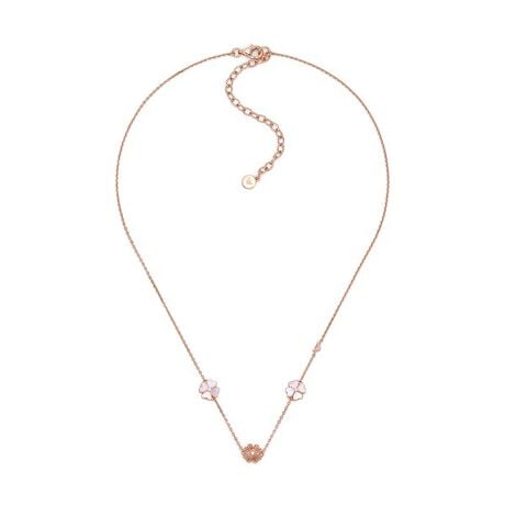 ポリッシュ仕上げのローズゴールドトーンのスターリングシルバーがステーションネックレスの繊細なチェーンを形作り、精緻なアクセントを添えたマザーオブパールによって引き立てられています。ロブスタークラスプで留める流線形のシルエットは、デザインと素材への上品なアプローチを反映しています。