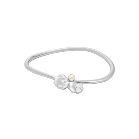 ポリッシュ仕上げのシルバートーンブラスを使用したこの彫刻的なバングルは、センターの輝くパールでアクセントを添えた流れるようなフローラルデザインが特徴です。エンポリオ・アルマーニのモダンなエレガンスを反映した、滑らかなカーブのシルエットと柔らかな質感の組み合わせが、上質なステートメントピースをエフォートレスで洗練された雰囲気に仕上げています。