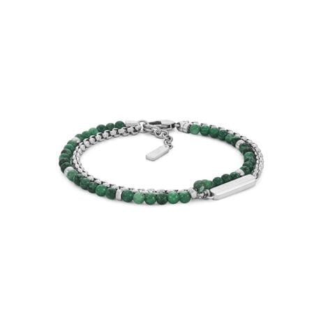 天然グラスアゲートのビーズとマットなシルバートーンのステンレススチールを組み合わせたブレスレット。落ち着きと現代性の両方を兼ね備えています。ブラッシュ仕上げのメタルのアクセントと精密な構造が、ストーンの有機的なカラーバリエーションにバランス感覚をもたらしています。ロブスタークラスプの留め具が確実な装着を保証し、現代のワードローブにエフォートレスに加えることができます。