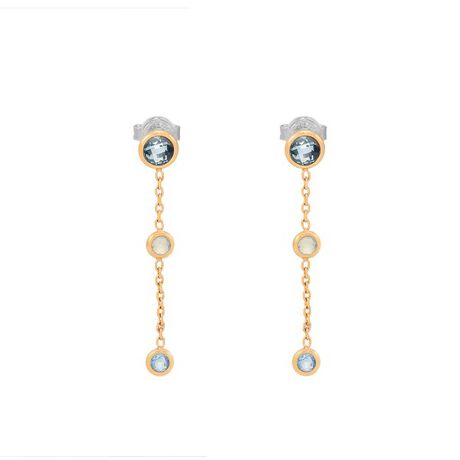 ポリッシュ仕上げのゴールドトーンステンレススチールと、滑らかなブルーシーグラスとクリアな輝きのアクセントを組み合わせたミニマルなドロップピアスです。バックでポスト留めのデザインが、シームレスでモダンな仕上がりを約束します。