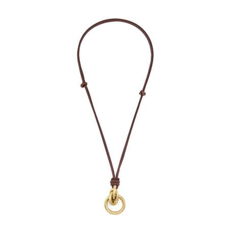 ソフトでモダンなカーブを描くポリッシュ仕上げのゴールドトーンのステンレススチール製ペンダントが、調節可能なロープに吊り下げられ、洗練されたミニマルなデザインを生み出しています。