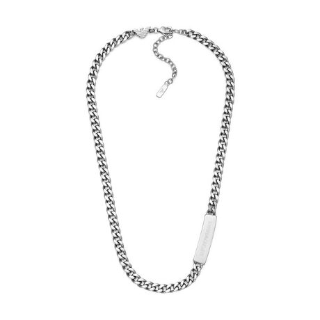 ポリッシュ仕上げのシルバートーンのステンレススチール製IDプレートがこのネックレスのデザインの中心で、さまざまな仕上げをさりげなく組み合わせ、質感を添えています。チェーンのすっきりとした洗練されたリンクが控えめなデザインを引き立て、ロブスタークラスプの留め具がしっかりとフィットします。エンポリオ・アルマーニのモダンで機能的なアクセサリーへのこだわりが、ディテールのひとつひとつに反映されています。