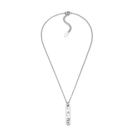 DIESELのシルバートーンのペンダントネックレスは、ステンレススチールとオーバルDロゴのペンダントが特徴です。