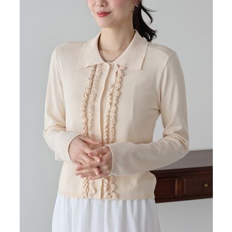 前立てにフリルをあしらい、ガーリーな印象に仕上げたニットカーディガン。