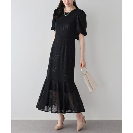 繊細なレースにラメ入りのジャガードを施した、上品な素材を使用したワンピース。