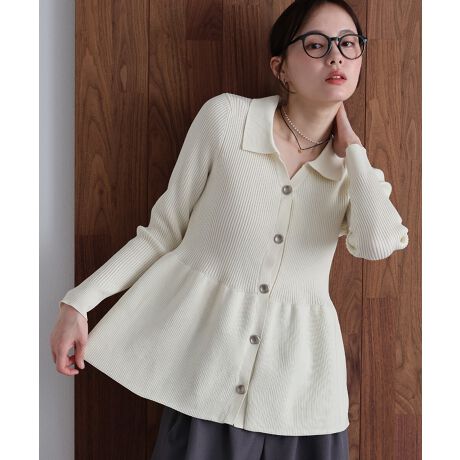 ペプラムデザインとシルバーボタンがアクセントになるニットカーディガン。