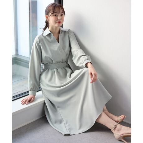 襟付きのVネックでデコルテをスッキリ見せ、魅力的に着痩せが叶う大人上品なワンピース。