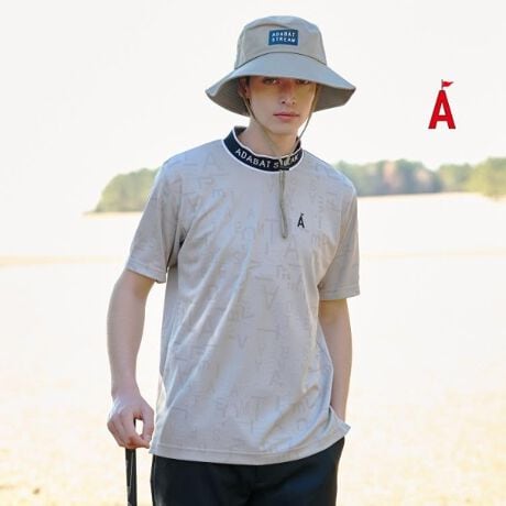 身頃に施されたロゴの凹凸ジャカードが特徴的なモックネック半袖シャツです。