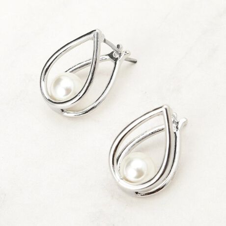 ドロップ型のメタルパーツにフェイクパールを閉じ込めたようなデザインのピアス。