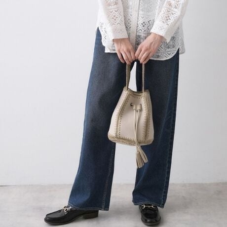 柔らかな風合いのスエード調合皮を使用した、上品さと温かみを兼ね備えたバケツ型バッグ。