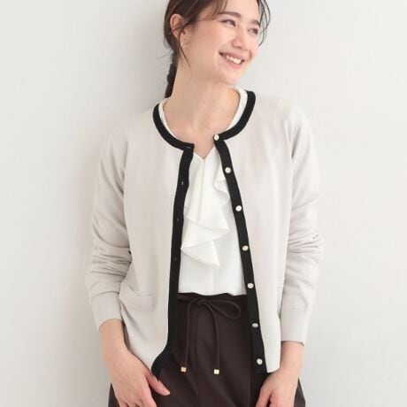 すっきりした表情、目が綺麗なコンパクト見えニットカーディガン。