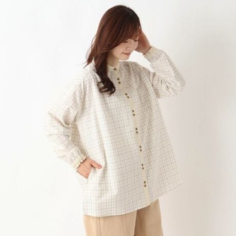 スタンドカラーに控えめなボタンを並べたデザインは、どこか懐かしく、優しい雰囲気をまといます。