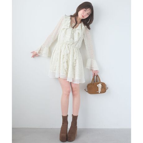 繊細なシフォン素材に、たっぷりとフリルを重ねたフェミニンムード溢れるミニワンピース。