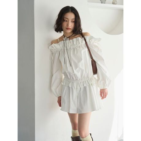 デコルテのフリルが華やかな印象を与えるミニロンパース。衿ぐりとウエストにはゴムを通し、両サイドの紐でフィット感を調整できる仕様にしています。肩紐は取り外し可能で、気分やスタイリングに合わせてアレンジできるのも魅力。フェミニンなムードと軽やかな着心地が楽しめる一着です。