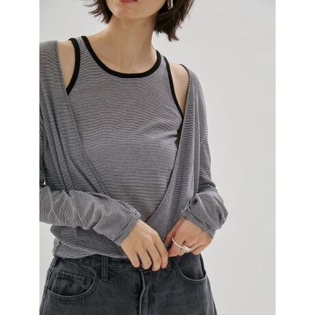 肌触りの良いフライス生地を使用したストレッチ性のあるレイヤードトップス。伸縮性のある生地なのでデイリー使いはもちろん、ヨガやピラティス・ジムでのウェア等の合わせにも来て頂けます。