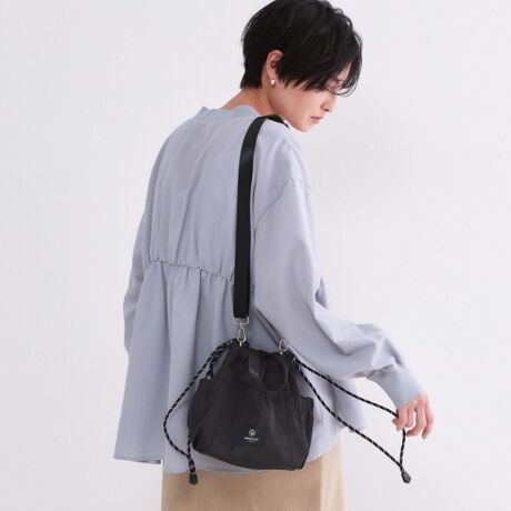 ハンズフリーでお出かけできる巾着デザインのショルダーバッグ