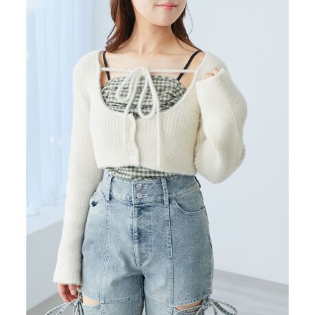 ふんわりとしたシャギー素材のニットカーディガンと、ギャザーデザインがポイントのキャミをセットにしたレイヤードアイテム。