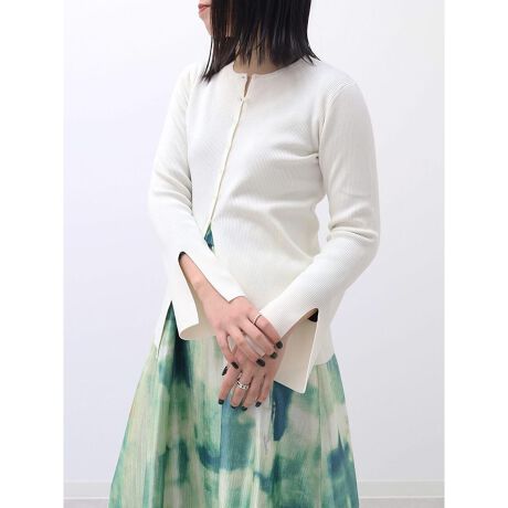 繊細なリブ編みが華奢見えを叶えるコンパクトカーディガン。ボディに心地よくフィットする女性らしいシルエットながら、着心地は軽やかでストレスフリー。フロントの裾にはボタンを付けず、軽く開いたデザインに仕上げることでウエストラインを自然に引き立て、スタイルアップも叶えてくれます。さらに袖口にはスリットを施し、さりげない抜け感と動きをプラス。洗練されたミニマルなルックスの中に、細部のディティールが映える一着です。