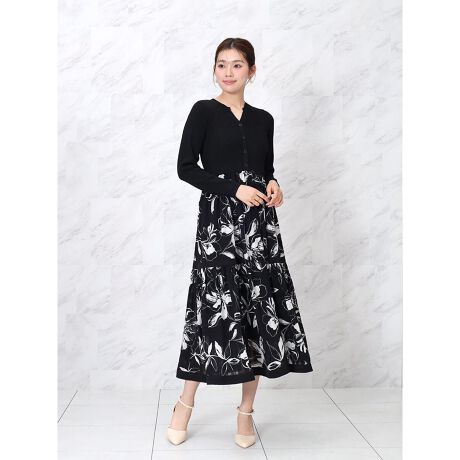 カーディガン風のニットトップスとシアー素材のスカートを組み合わせたデザインで、着るだけでコーディネートが完成します。
