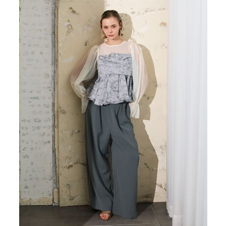 シアー素材を組み合わせたペプラムトップスとパンツのセットアップドレス。
