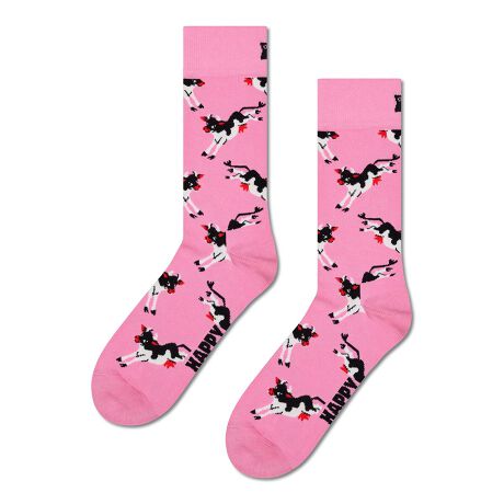 鮮やかなピンクの牛柄ソックス。楽しげな牛の繰り返し模様が施されており、どんなコーディネートにも楽しいアクセントを加えるのに最適です。