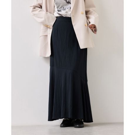 シンプルですが女性らしいラインを表現してくれるサテンツイル素材の切替マーメイドスカート。