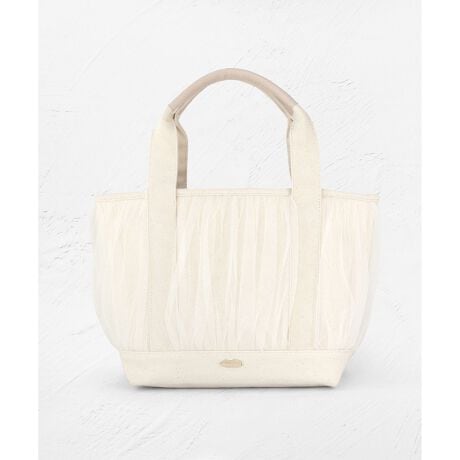 ふわりとしたギャザーチュールにつつまれた、ほんのりフェミニンなキャンバストート。シンプルなフォルムにプラスしたチュールのディテールが抜け感のあるエッセンスとなり、スタイリングに合わせるだけでおしゃれなたたずまいにアップデートできます。
