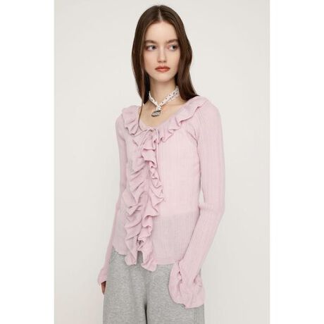 【FRONT FRILL KNIT TOPS】■POINTフロントに施された立体フリルが印象的なニットトップス。程よい透け感と華奢見えするコンパクトなシルエットが、女性らしさを引き立てます。袖先にもフリルをあしらい、1枚でコーディネートが華やぐデザインに仕上げました。■DETAILカラーは使いやすいブラック・ホワイトに加え、着こなしのアクセントになるライトピンク・ライトイエローの全4色展開。デイリーからお出かけまで幅広く活躍するアイテムです。■STYLING王道のデニム合わせやスウェットパンツと合わせてラフに着用するコーディネートなど様々な着こなしをして頂けます。■FABRIC/MATERIAL透け感と伸縮性のあるニット素材を使用。■透け感:若干あり■光沢感:なし■伸縮性:なし■裏 地:なし※お取り扱い上のご注意・洗濯機表示の場合はネットに入れて弱水流で洗って下さい。・手洗いの場合はもみ洗いを避けて軽く押し洗いして下さい。・洗濯後は、速やかに形を整え干して下さい。・丈の長い製品、袖など伸びやすい箇所はハンガーで支えたり、平干しをすることで型崩れを防止できます。[注意事項]※画像の商品はサンプルです。実際の商品と仕様、加工が若干異なる場合があります。※画像の商品は光の照射や角度、お使いのモニター環境により、実物と色味が異なる場合がございます。※着用、お取り扱いの際は、アテンションタグをご確認ください。※一部予約商品につきましては生産上の都合によりお届け予定日や店頭発売と前後する場合もございます。※追加生産商品は、一部の店舗、通販で販売中の場合がございます。予めご了承下さい。