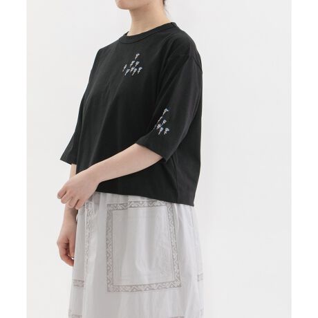 前後と左袖の3カ所にフラワー刺繍が入ったTシャツ。良質なUSAコットンで、程よくゆとりがありつつ、長すぎないジャストな丈感です。長めの5分袖が新鮮な印象のトップスです。