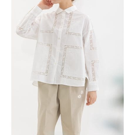 繊細なスワトー刺繍のハンカチをモチーフに、スクエア状の刺繍を並べたオリジナルクロスが印象的なシャツ。パリッとしたハリ感のあるタイプライター素材でナチュラルになりすぎず、程よい甘さのあるメンズライクなシャツです。フルオープンでばさっと羽織るのもおすすめ。開けた時にちらりと見える配色ステッチもさりげないポイントです。