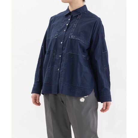 繊細なスワトー刺繍のハンカチをモチーフに、スクエア状の刺繍を並べたオリジナルクロスが印象的なシャツ。パリッとしたハリ感のあるタイプライター素材でナチュラルになりすぎず、程よい甘さのあるメンズライクなシャツです。フルオープンでばさっと羽織るのもおすすめ。開けた時にちらりと見える配色ステッチもさりげないポイントです。