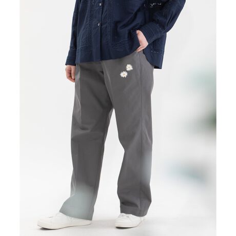ハリとほのかな光沢のある、しっかりとしたTCツイル生地を使用したワークパンツ。センタープレスを施すことで、カジュアルすぎずきちんと感のある表情に。大人のカジュアルスタイルはもちろん、きれいめコーデにもおすすめです。左前にはマーガレットのプリントをあしらい、さりげないポイントに。裾をロールアップすると、配色パイピングがのぞきます。右後ろにスワンネーム入り、ウエストはゴム仕様で内紐付き。両サイドポケット付き。