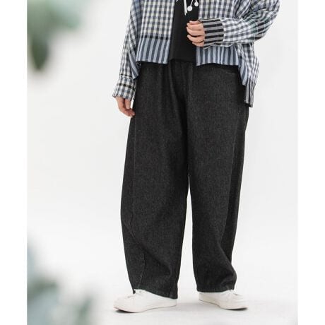 トレンド感のあるシルエットが魅力の、丸みを帯びたバレル型デニム。立体感のあるフォルムで、コーディネートに自然なこなれ感をプラスします。レングスは、長めのフルレングスと、くるぶしがすっきり見える短め丈の2タイプ展開。右後ろにはロゴプリントを施し、さりげないアクセントに。ファイブポケットの本格デニム仕様ながら、ウエストはゴム仕様で内紐付きの楽な穿き心地です。