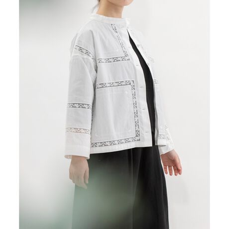 繊細なスワトー刺繍のハンカチをモチーフに、スクエア状の刺繍を並べたオリジナルクロスが印象的なシャツ。パリッとしたハリ感のあるタイプライター素材でナチュラルになりすぎず、ほどよい甘さのあるブラウスです。前後どちらでも着用できる2WAY仕様で、トップスとしてはもちろん、軽い羽織としても活躍。短めの7分袖がすっきりとしたバランスです。