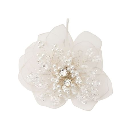 透け感のある軽やかなシルクオーガンジーを幾重にも重ね、大輪の花を瑞々しく表現したコサージュ。花びらの間から覗くパール調のパーツやカットガラスが、動くたびに繊細な煌めきを放ち、胸元に華やかな彩りを添えます。上質なマテリアルならではの柔らかな質感と立体的な造形美が装いをエレガントにアップデート。フォーマルなジャケットからシンプルなワンピースまで合わせやすく、ハレの日のコーディネートをより一層洗練された印象へと導く一品です。