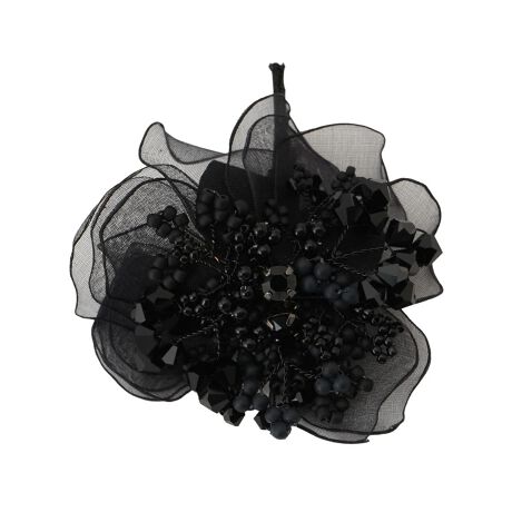透け感のある軽やかなシルクオーガンジーを幾重にも重ね、大輪の花を瑞々しく表現したコサージュ。花びらの間から覗くパール調のパーツやカットガラスが、動くたびに繊細な煌めきを放ち、胸元に華やかな彩りを添えます。上質なマテリアルならではの柔らかな質感と立体的な造形美が装いをエレガントにアップデート。フォーマルなジャケットからシンプルなワンピースまで合わせやすく、ハレの日のコーディネートをより一層洗練された印象へと導く一品です。
