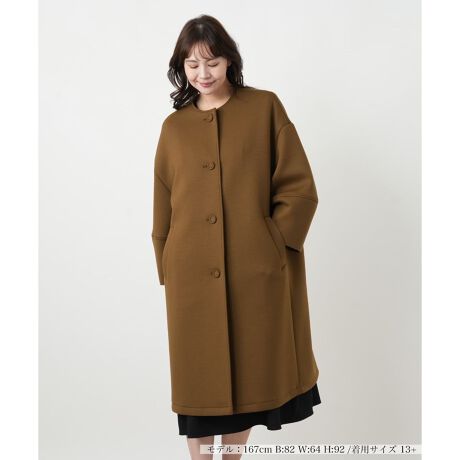 春先に軽やかに羽織れる、ノーカラーのコートです。すっきりとした丸首のデザインが、上品で女性らしい雰囲気を演出します。伸縮性のある素材を使用しているため、動きやすく快適な着心地。シンプルな無地のコートは、インナーやボトムスを選ばず、オンオフ問わず活躍します。洗練されたシルエットが、装いをぐっと格上げしてくれる一着です。