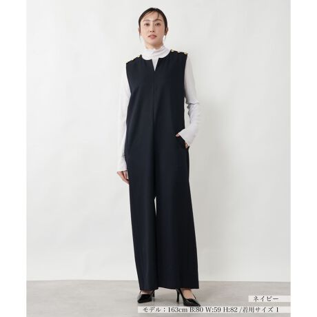 洗練された大人のカジュアルスタイルが完成する、ノースリーブオールインワン。肩にあしらわれた飾りボタンがシンプルなデザインにマリン風の華やかなアクセントを添えています。すとんと落ちる優美なワイドシルエットとさらりとしたファブリックの質感が、初夏のコーディネートに心地よい抜け感を演出。背面のファスナーによりスムーズに着脱しやすく、デイリーユースから週末のお出かけまで幅広く活躍してくれそうな一着です。