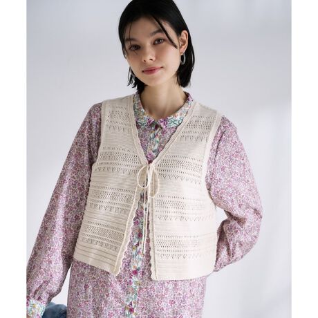 繊細な透かし編みが目を惹く、Vネックのニットベスト。