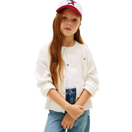 繊細な透かし模様を加えたケーブルカーディガン。軽やかなニットが愛らしく、重ね着をしても重たく見せません。左胸にはアクセントとなるフラッグロゴのワンポイントを施しました。ドロップショルダーのリラックスフィットを採用しており、インナーのシルエットを選ぶことなくゆったりと羽織れます。