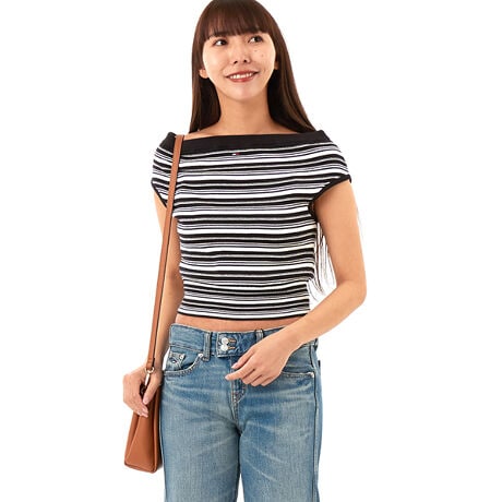 鎖骨やデコルテを美しく引き立てるオフショルダーが、女性らしさを際立たせるセーター。フロントにはフラッグロゴのワンポイントをあしらい、さりげないアクセントをプラスしました。ランダムなボーダーパターンが軽やかな印象を演出。短めの着丈とタイトな裾シルエットで、スタイルアップ効果も期待できます。