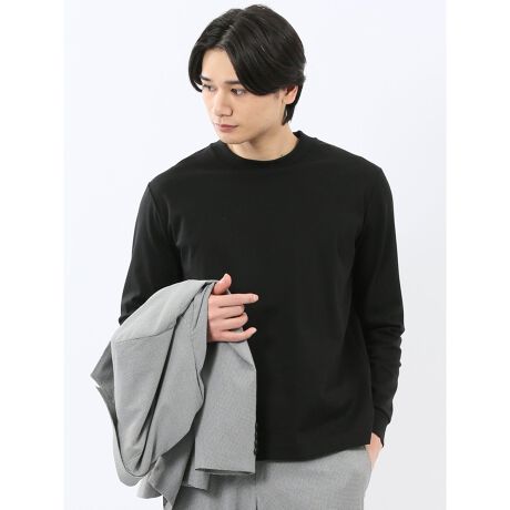 ジャケットの衿が汚れにくい、後ろ衿巾を高くしたスロープネックの長袖Tシャツです。衿・袖口のリブ切り替えと裾部分の表地切り替えがポイント。綺麗目なインナーアイテムとしてジャケットインに最適な一枚です。プライベートからオフィスカジュアルまでオンオフ兼用で着回しが可能です。