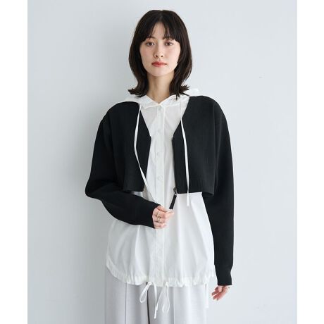 フーディシャツとショート丈カーディガンを組み合わせたデザイントップス。