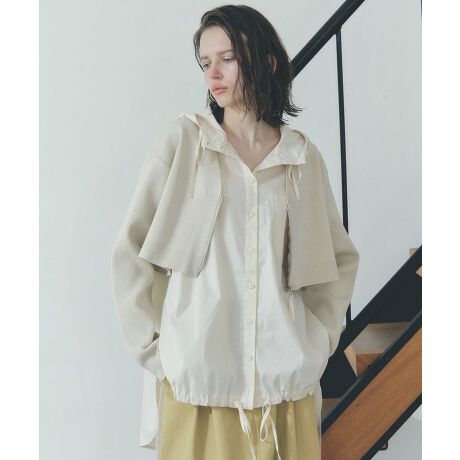 フーディシャツとショート丈カーディガンを組み合わせたデザイントップス。