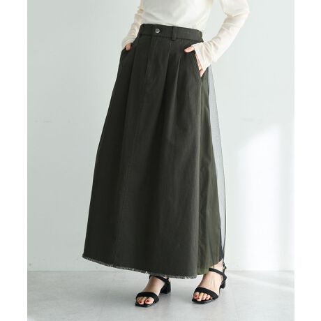 チノとチュールの組み合わせが軽やかな抜け感を演出するロングスカート。