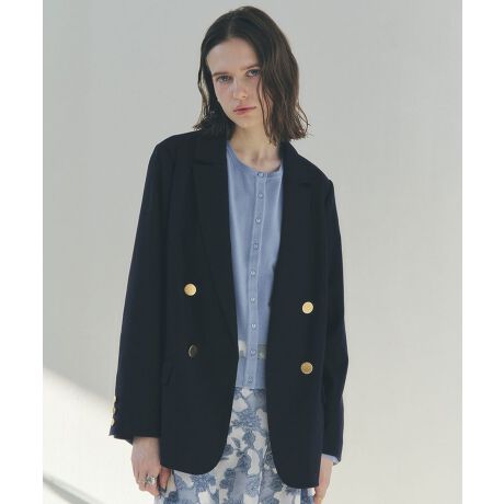 大きめの金ボタンが顔まわりに華やかさを添え、内側の裏地ストライプは袖口や動きの中でさりげないアクセントに。見えない部分までおしゃれを楽しめます。