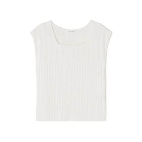 ハイゲージのノースリーブニット。単品としても、同素材のブルゾンのインナーとしてアンサンブルとしてもスタイリング頂けます。スクエアの空きがデコルテをキレイに見せてくれます。総針編みのため、しっかりとした肉感があり、リブのように体のラインを拾いません。袖先が肩から出るぐらいの袖丈で、気になる肩周りや脇を隠してくれます。長さ違いのストライプを組み合わせ、バストトップよりも高い位置で柄を変えることで、目線があがりスタイルアップ効果のあるトップスです。